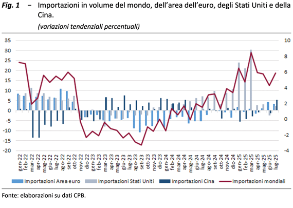 Il contesto internazionale resta instabile, a causa del deterioramento delle relazioni internazionali. Nella prima parte del 2025 gli scambi sono stati fortemente spinti dalle importazioni degli Stati Uniti, che tuttavia hanno rallentato bruscamente dalla primavera (fig. 1). Gli effetti del protezionismo non sembrano al momento tangibili sui prezzi, ma l’imposizione di dazi da parte degli Stati Uniti e l’apprezzamento dell’euro, di circa il 13 per cento sul dollaro dall’inizio dell’anno, inducono una netta perdita di competitività per gli esportatori europei. Il Fondo monetario internazionale (FMI) ha migliorato le attese per quest’anno ma ha limato l’attesa sulla crescita del PIL dell’area dell’euro per il prossimo; le previsioni sono soggette a un’elevata incertezza delle ipotesi, soprattutto per quanto attiene alle politiche commerciali. I prezzi delle materie prime energetiche si attestano su valori contenuti ma le banche centrali (BCE e FED) restano caute sul percorso di allentamento delle condizioni monetarie, i cui sviluppi dipenderanno soprattutto dall’evoluzione dell’inflazione al consumo.