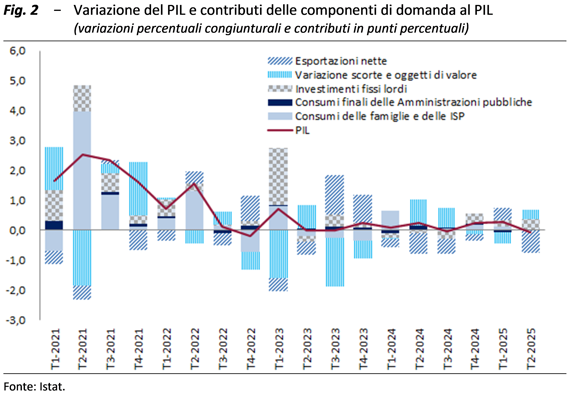 Dopo la temporanea accelerazione in inverno il PIL dell’Italia si è ridotto nel secondo trimestre (-0,1 per cento in termini congiunturali; fig. 2), per la prima volta da quasi tre anni; la dinamica produttiva si mantiene inferiore a quella dell’area dell’euro. La volatilità della fase congiunturale in Italia è ascrivibile al commercio con l’estero: al recupero delle esportazioni nella media dei primi tre mesi del 2025 (2,2 per cento), come anticipazione degli scambi prima dell’entrata in vigore dei nuovi dazi, ha fatto seguito una simile contrazione in primavera (-1,9 per cento); secondo le informazioni più recenti le esportazioni sarebbero diminuite sensibilmente in agosto, soprattutto verso gli Stati Uniti. I consumi restano frenati dall’elevata propensione al risparmio mentre l’accumulazione di capitale è vivace, sostenuta anche dal miglioramento delle condizioni creditizie. Dal lato dell’offerta il settore terziario ristagna e l’industria non accenna a recuperare. L’inflazione italiana (NIC) è stabile, all’1,6 per cento in settembre, confermandosi inferiore a quella dell’area dell’euro. Sul mercato del lavoro, l’occupazione è rimasta invariata nei mesi primaverili e la dinamica delle retribuzioni contrattuali orarie si è attenuata; i salari in termini reali restano nettamente inferiori a quelli del 2020.