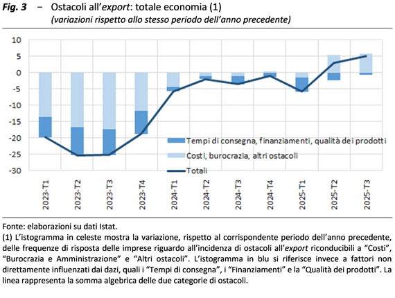 La fiducia di famiglie e imprese si mantiene su valori relativamente contenuti, mentre l’incertezza è elevata. Nel riquadro si analizzano le indagini presso le imprese manifatturiere italiane, con riferimento agli ostacoli all’export; come atteso tali ostacoli si sono nettamente acuiti negli ultimi trimestri (fig. 3), soprattutto con riferimento alle categorie influenzate dalle barriere tariffarie. Analizzando in dettaglio le aree e i settori emerge come tali ostacoli siano particolarmente percepiti nel Nord-Est e per le imprese operanti nelle produzioni di bevande, abbigliamento e altri comparti normalmente associati al Made in Italy.
