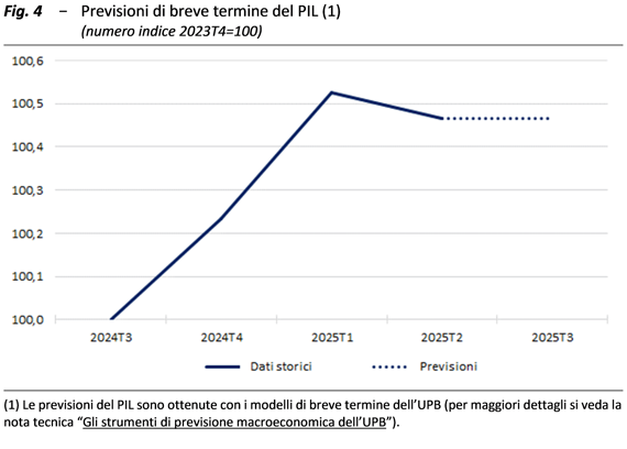 Le stime dei modelli di breve termine dell’UPB indicano per il terzo trimestre una congiuntura ancora debole, sostanzialmente stagnante (fig. 4). La previsione di crescita del PIL per l’intero 2025 si conferma nell’intorno dello 0,5 per cento, come indicato dall’UPB in occasione della validazione dello scenario macroeconomico del Documento programmatico di finanza pubblica (DPFP) 2025; le prospettive sono comunque caratterizzate da rischi significativi, soprattutto a causa del frammentato contesto internazionale.
